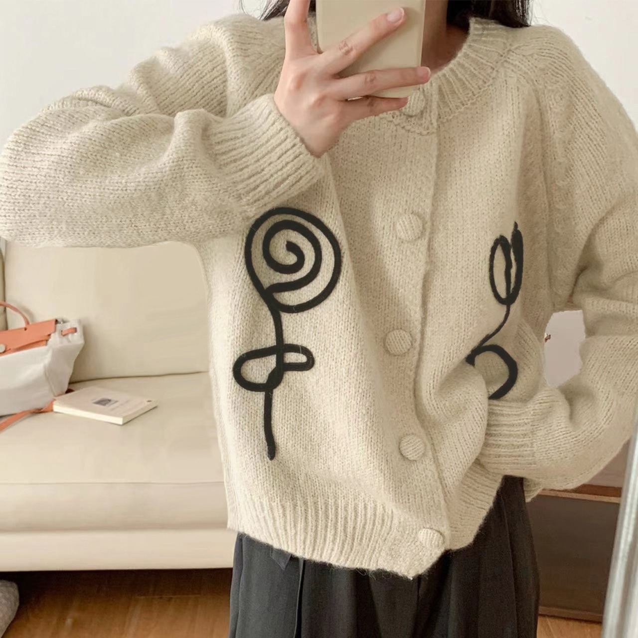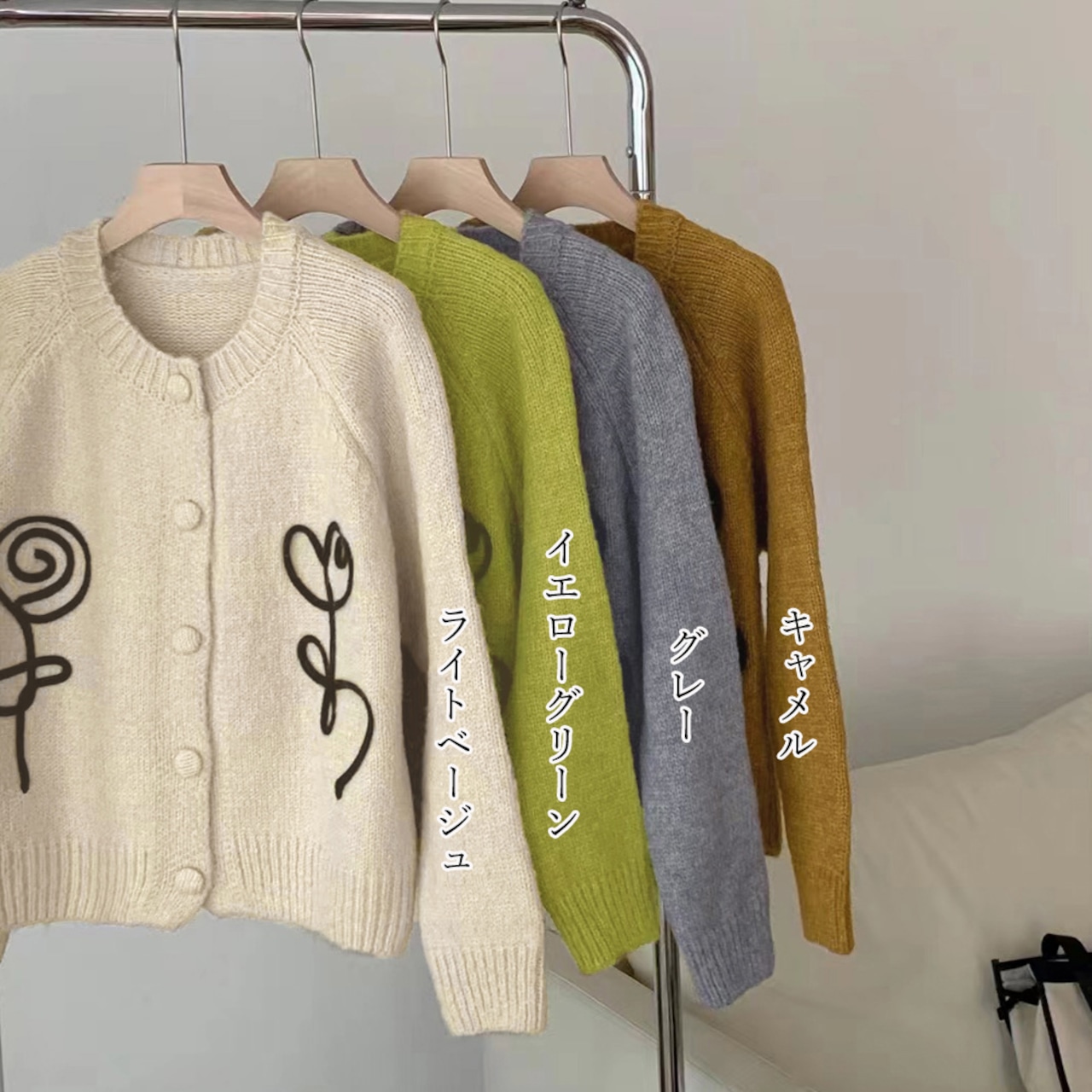 可愛らしい花の刺繍が施されたニットカーディガンです